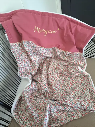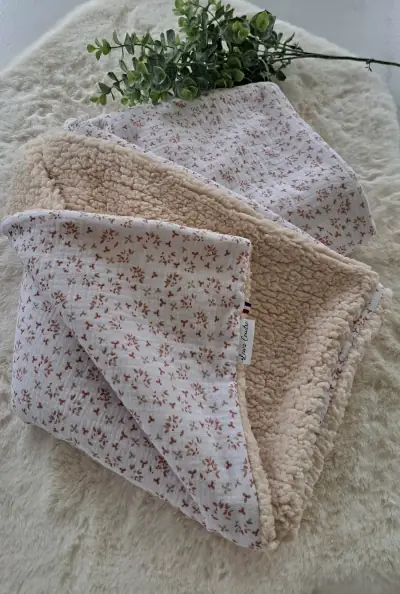 Toutes les couvertures sont cousues avec du tissus en double gaze de coton et en coton 100% oeko tex pour la première face et en minky lisse (tissus doudou) ou sherpa (effet mouton) pour la deuxième face.